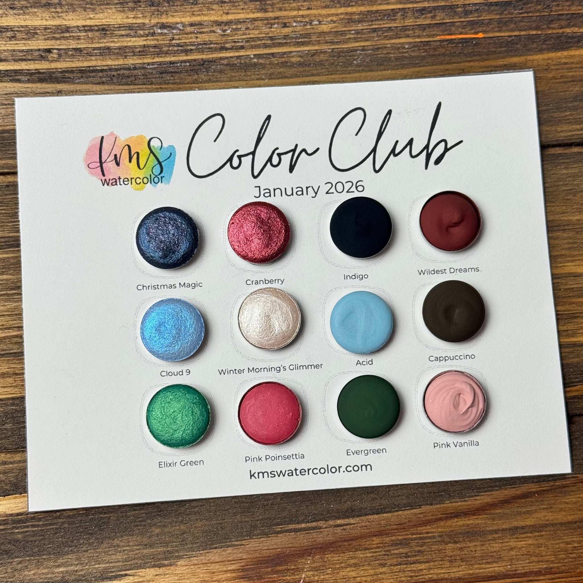 KMS Watercolor “January 2026 Color Club” contains 12 paints (6 shimmer, 6 matte)