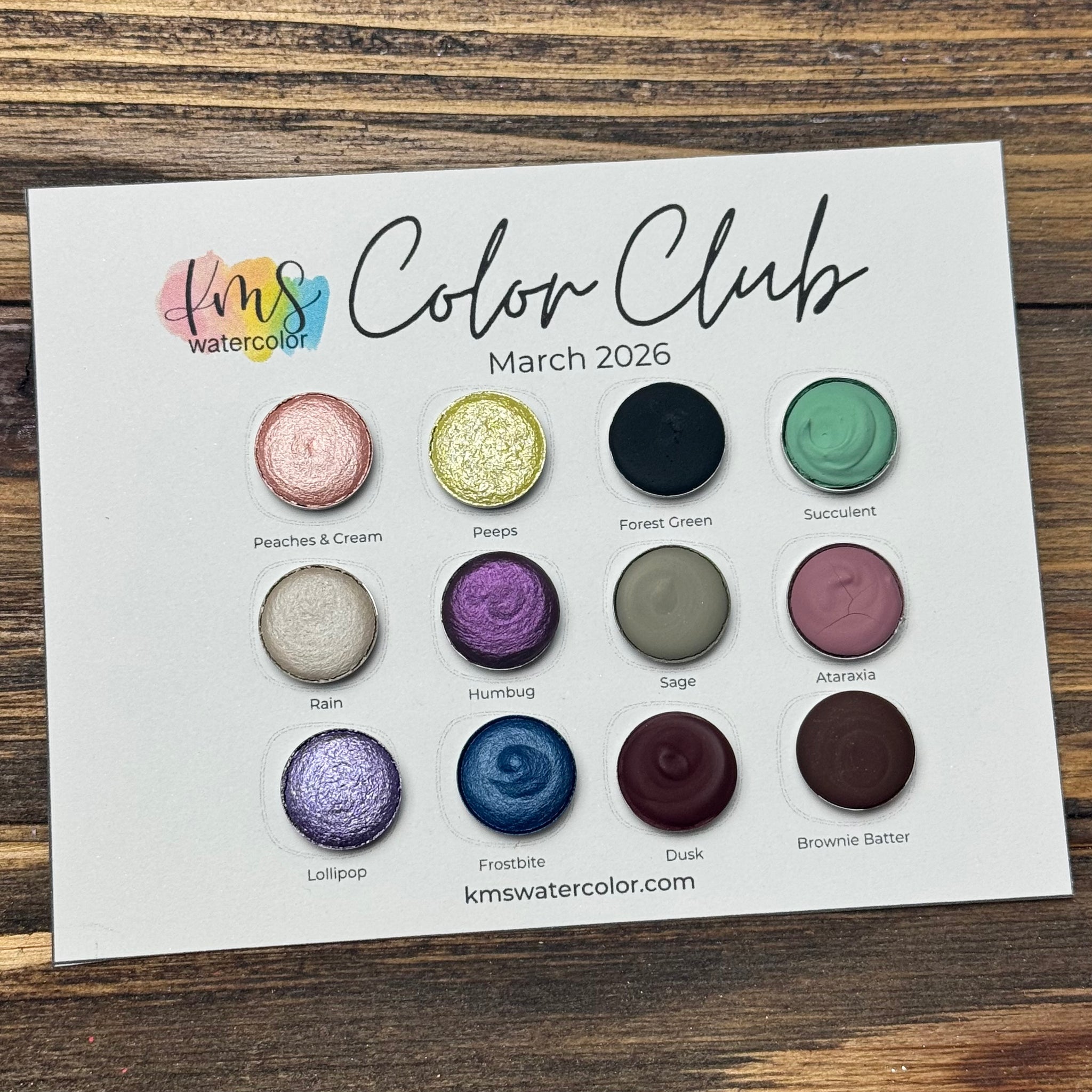 KMS Watercolor “March 2026 Color Club” contains 12 paints (6 shimmer, 6 matte)