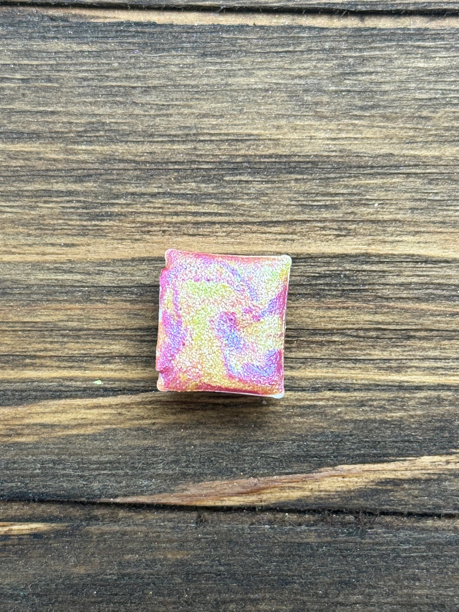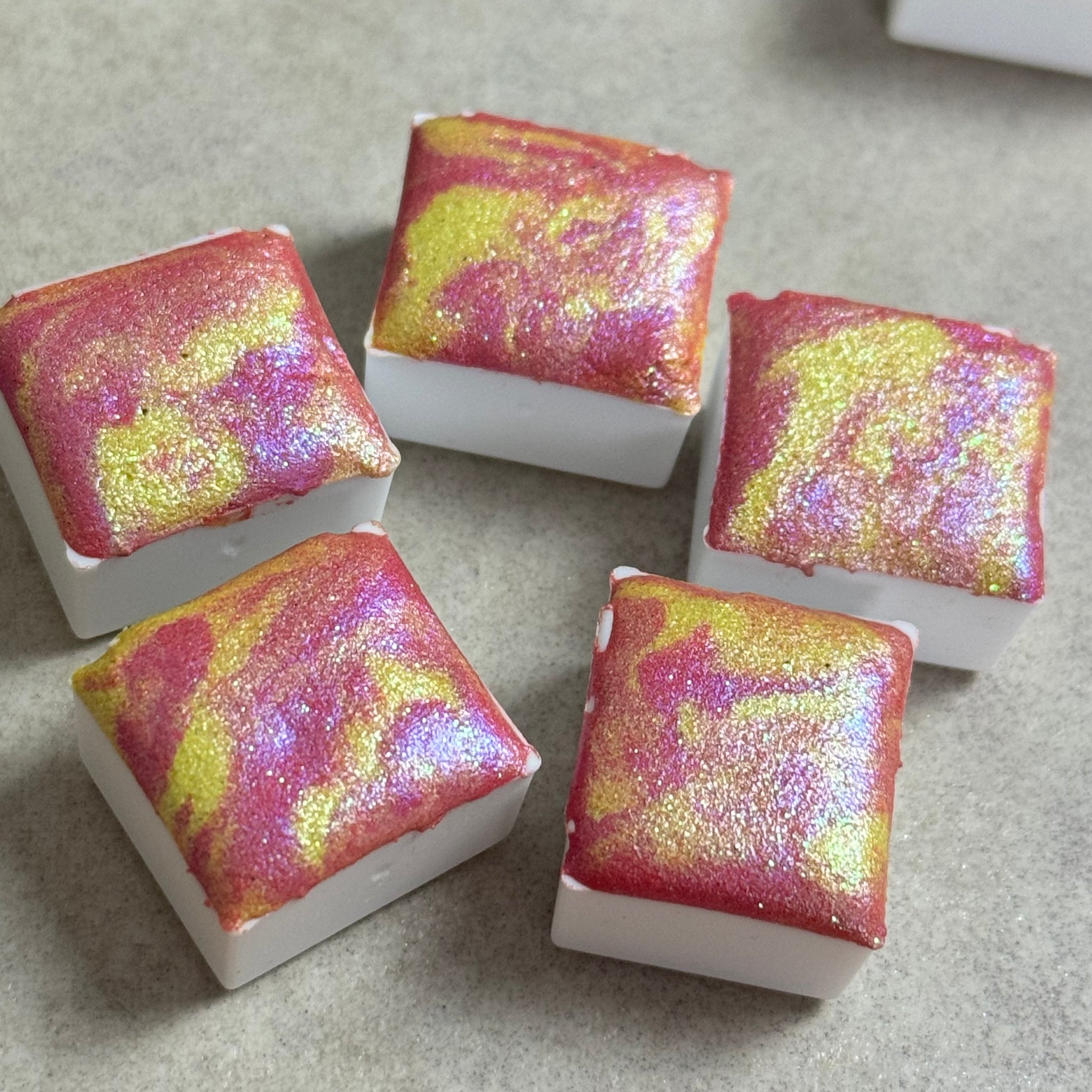 Each of our colors are made with high quality, non toxic, ethically sourced pigments and micas. Acacia gum is used to bind the paint together. Vegetable glycerine is used to prevent cracking and to improve re-wetting. A small amount of clove oil (natural preservative) is added to prevent mold growth. Each paint is made by hand, the traditional way with muller and slab and are slowly air dried. KMS Watercolor paints are non-toxic and vegan.
