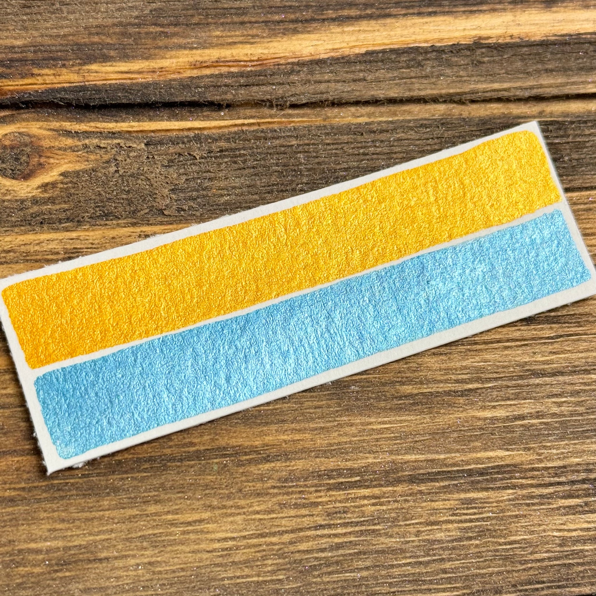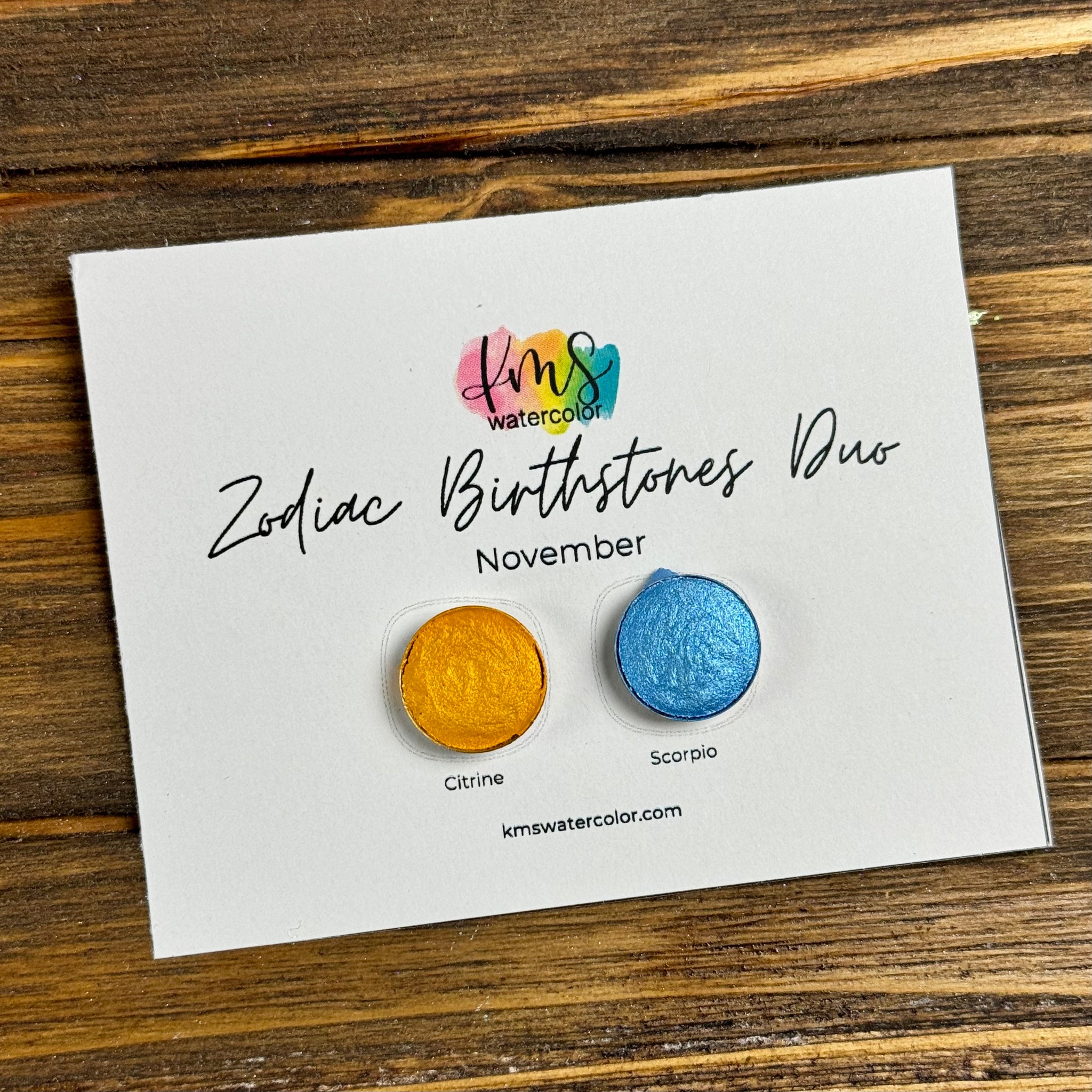 KMS Watercolor “November Zodiac Birthstone Duo” contains two shimmer paints, “Citrine” (Yellow) and “Scorpio” (Blue).